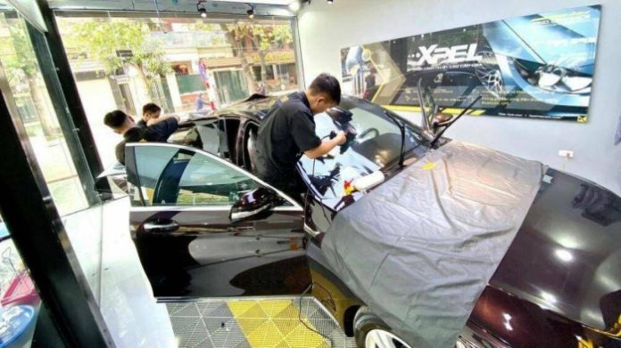 Nhân viên đại lý Toyota đang dán kính cho khách
