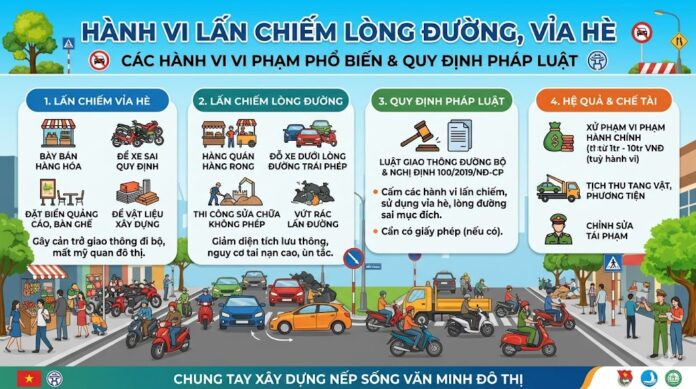 Dưới đây là các hành vi lấn chiếm vỉa hè phổ biến và mức phạt cụ thể áp dụng trong năm 2026 theo Nghị định 168/2024/NĐ-CP: