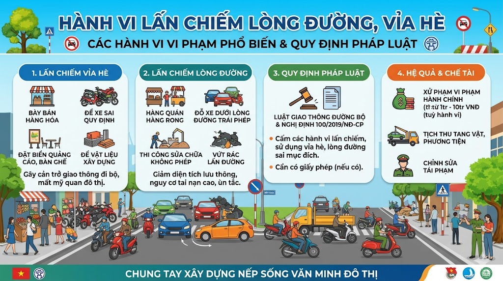 Lấn chiếm vỉa hè là hành vi sử dụng trái phép không gian vỉa hè vào mục đích cá nhân, gây cản trở giao thông và ảnh hưởng đến đời sống của cộng đồng. Các hình thức lấn chiếm phổ biến bao gồm: