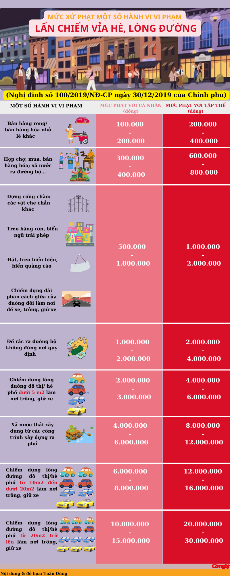 Hành vi bán hàng rong, bán hàng nhỏ lẻ trên vỉa hè là một trong những hình thức lấn chiếm phổ biến nhất. Mức phạt cho hành vi này như sau: