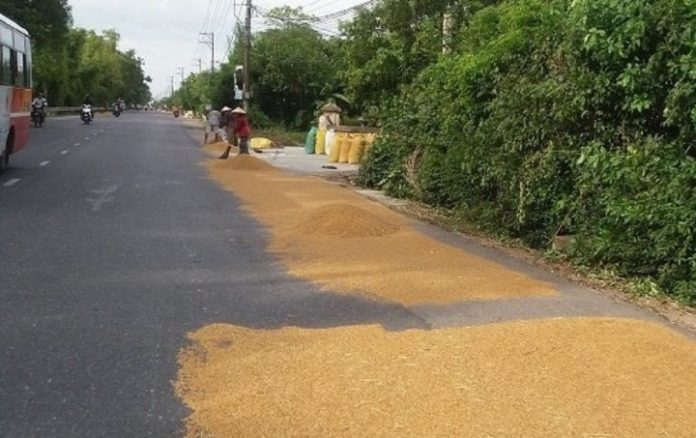 Phơi thóc trên đường gây cản trở, tiềm ẩn nguy cơ tai nạn giao thông. (Ảnh minh họa)